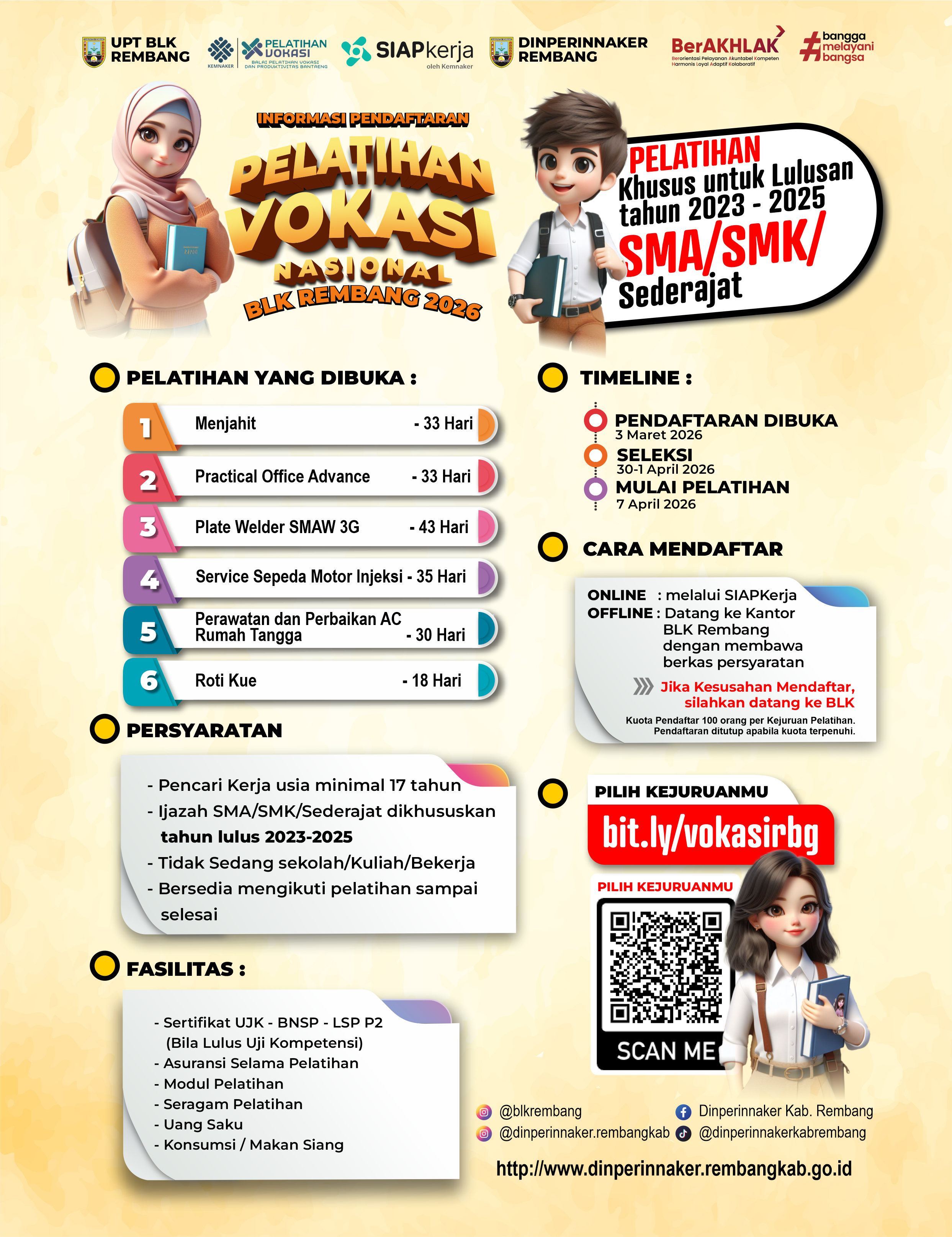 INFORMASI PENDAFTARAN PELATIHAN VOKASI NASIONAL BLK REMBANG TAHUN 2026