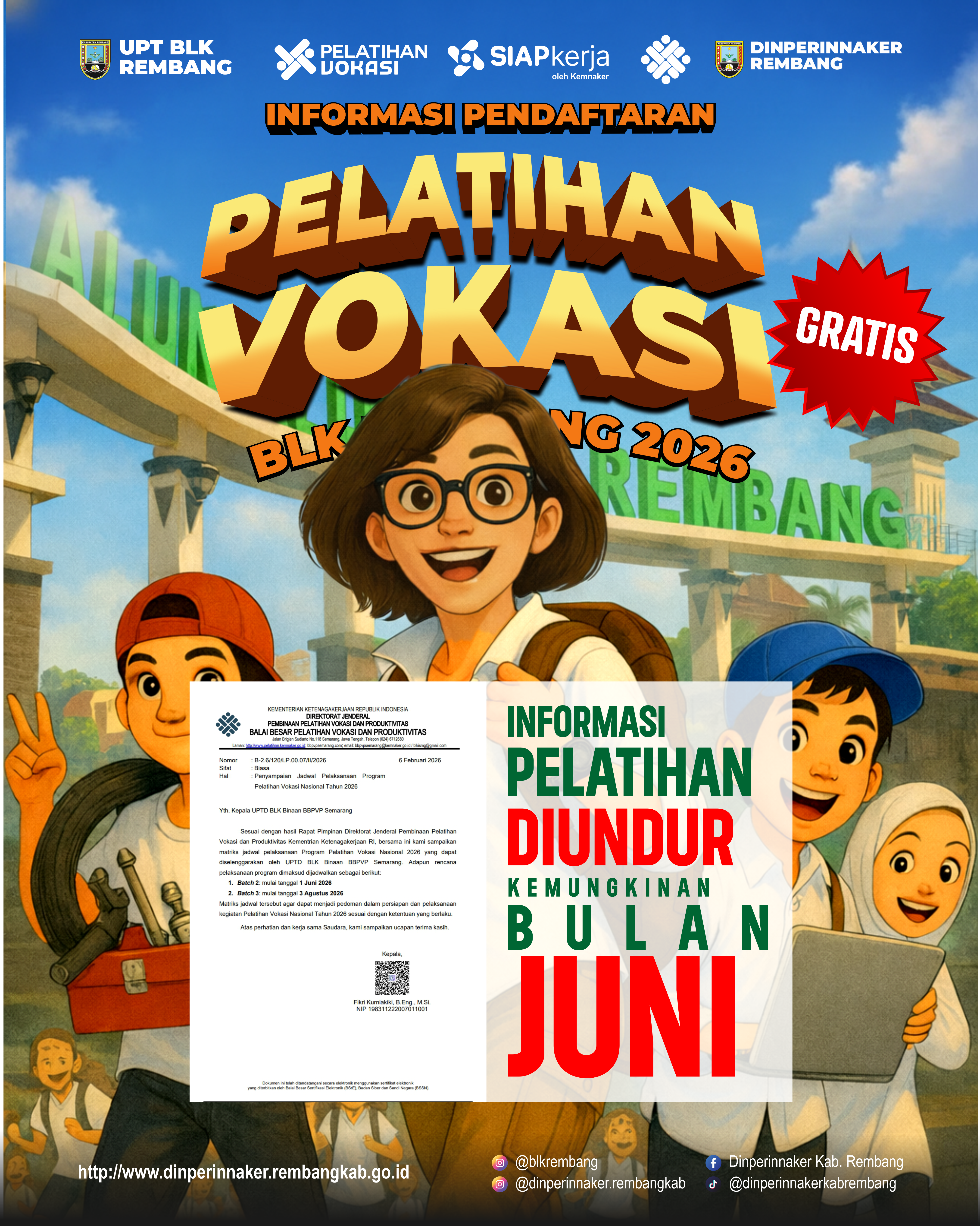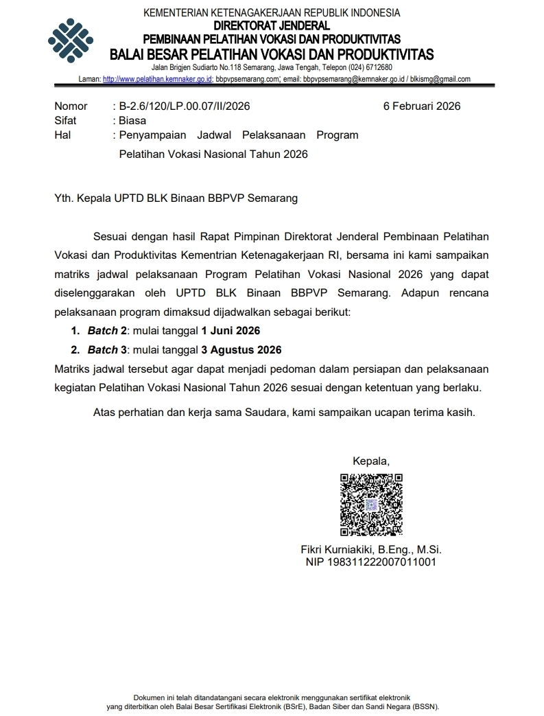 Pelatihan Diundur 19 Feb 2026 By Dinperinnaker Rembang 1 min read Share this Post Pelatihan UPT BLK Rembang diundur Bulan Juni Panduan Praktis PERJANJIAN KERJA WAKTU TERTENTU (PKWT) INFO PENDAFTARAN PELATIHAN BLK REMBANG 2026